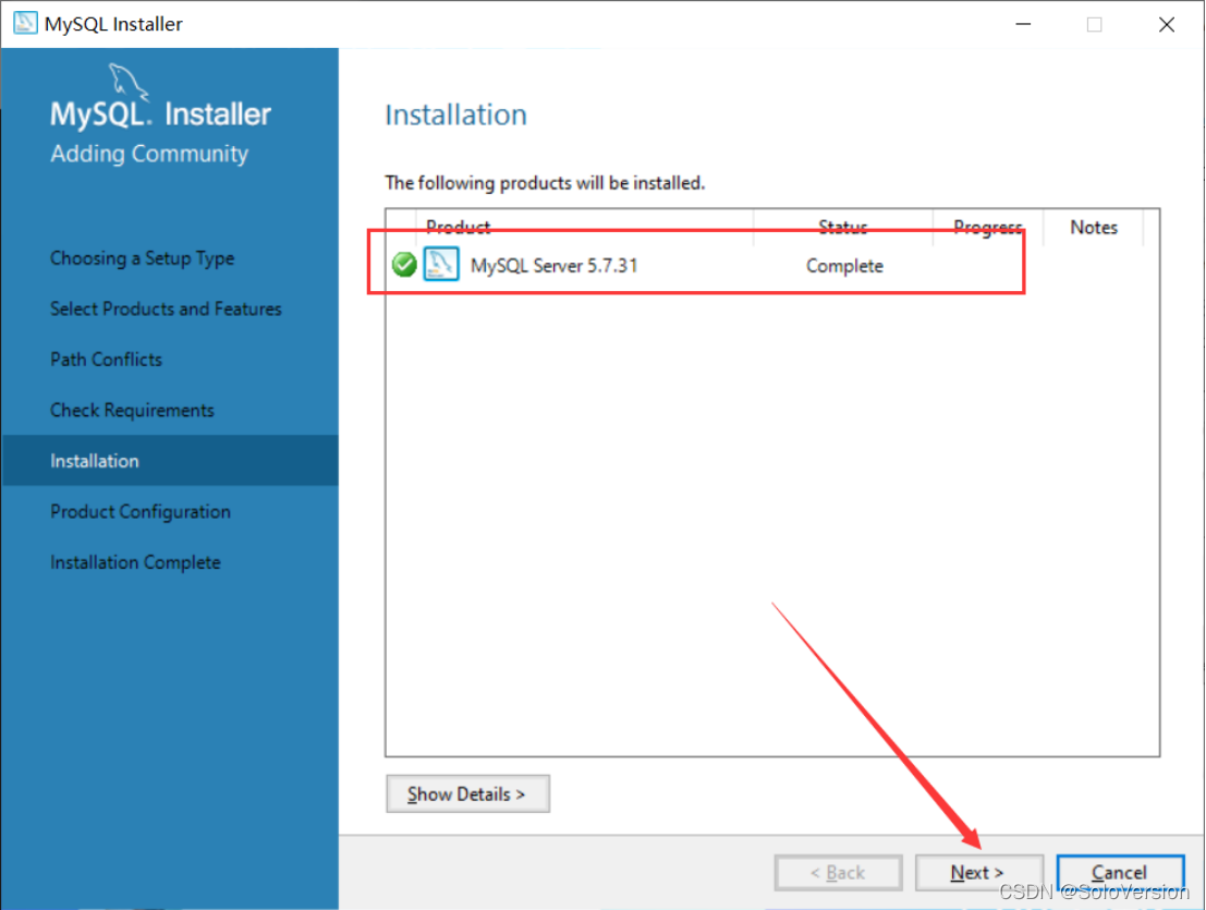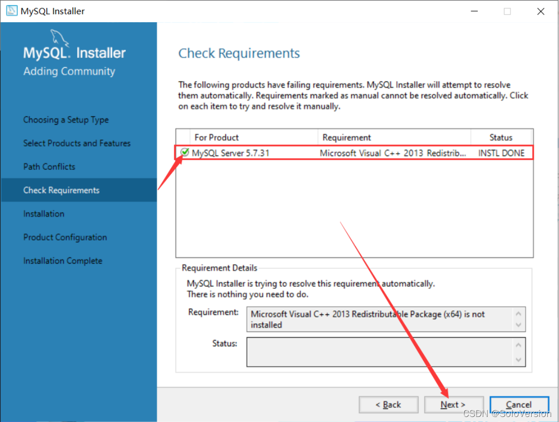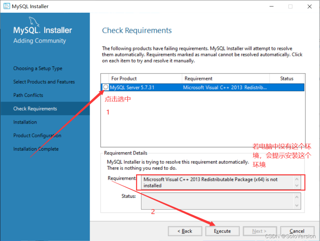 9. 先选中“MySQL Server5.7.31”,若电脑中没有这个环境,会提示安装“Microsoft Visual C++ 2013”环境,点击“Execute”