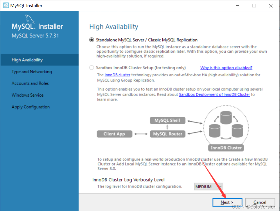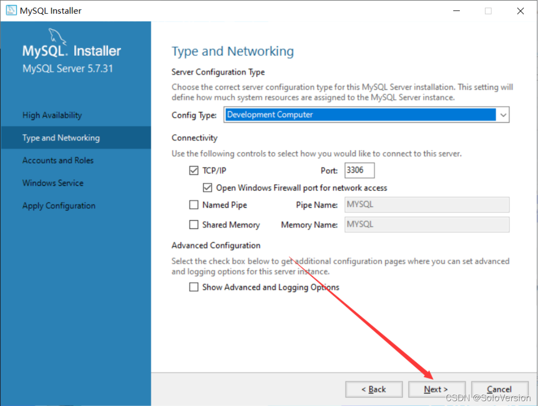3. 先选中“MySQL Server 5.7.31” ,之后点击下方的蓝色“Advanced Options”