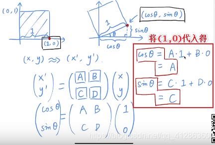 (1,0)旋转后成为(sin,cos),利用这个信息代入下面的式子,可以求出A=cos,C=sin,我们再考虑另外一个特殊的点就可以求出B,D,用(0,1)来计算。