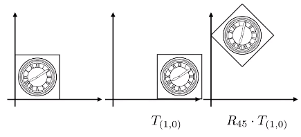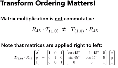 - 变换的顺序很重要。数学层次上的原因:矩阵的乘法的顺序是不可以改变的(矩阵不满足乘法交换律)。