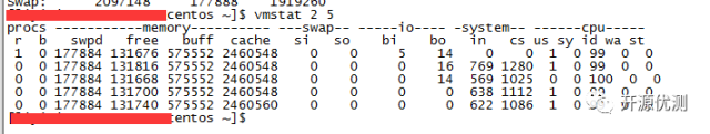 一般情况下vmstat工具的使用是通过两个数字参数来完成的,第一个参数是采样的时间间隔数,单位是秒,第二个参数是采样的次数,如下命令:
