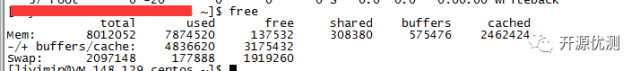 查看内存情况,将used的值减去buffer和cache的值就是你当前真实内存使用。