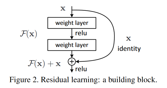 ResNet块定位为\(y=F( x_{i} ,W_{i} )+x, (1)\)