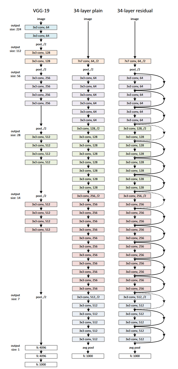 残差网络: 基于上述的简单网络,我们插入快捷连接(图3-2,右),将网络转换为其对应的残差版本。当输入和输出具有相同的维度时(图3中的实线快捷连接)时,可以直接使用恒等快捷连接(方程(1))。当维度增加(图3中的虚线快捷连接)时,我们考虑两个选项:(A)快捷连接仍然执行恒等映射,额外填充零输入以增加维度。此选项不会引入额外的参数;(B)方程(2)中的投影快捷连接用于匹配维度(由1×1卷积完成)。对于这两个选项,当快捷连接跨越两种尺寸的特征图时,它们执行时步长为2。