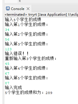 System.out.println("输入完成\n5个学生的成绩和为:"+sum);