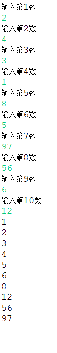 package zuoye; import java.util.Scanner; public class seven { public static void main(String[] args) { Scanner input =new Scanner(System.in); int a[] =new int[10]; for(int i=0;i<a.length;i++) { System.out.println("输入第"+(i+1)+"数"); a[i]=input.nextInt(); } sort(a); for(int i=0;i<a.length;i++) { System.out.println(a[i]); } } public static void sort(int a[]) { for(int i=0;a.length-1>i;i++) { for(int j=1;j<a.length-i;j++) { if(a[j-1]>a[j]) { int temp =a[j-1]; a[j-1]=a[j]; a[j] = temp; } } } }}