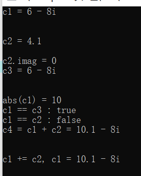 #include "Complex.hpp" #include <iostream> int main() { using namespace std; Complex c1(6, -8); const Complex c2(4.1); Complex c3(c1); cout << "c1 = "; c1.show(); cout << endl; cout << "c2 = "; c2.show(); cout << endl; cout << "c2.imag = " << c2.get_imag() << endl; cout << "c3 = "; c3.show(); cout << endl; cout << "abs(c1) = "; cout << abs(c1) << endl; cout << boolalpha; cout << "c1 == c3 : " << is_equal(c1, c3) << endl; cout << "c1 == c2 : " << is_equal(c1, c2) << endl; Complex c4; c4 = add(c1, c2); cout << "c4 = c1 + c2 = "; c4.show(); cout << endl; c1.add(c2); cout << "c1 += c2, " << "c1 = "; c1.show(); cout << endl; }