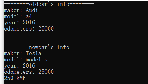#include<iostream> #include"electricCar.hpp" int main() { using namespace std; //test class of Car Car oldcar("Audi", "a4", 2016); cout << "--------oldcar's info--------" << endl; oldcar.update_odometers(25000); oldcar.info(); cout << endl; //test class of ElectricCar ElectricCar newcar("Tesla", "model s", 2016,250,"250-kMh"); newcar.update_odometers(25000); cout << "\n--------newcar's info--------\n"; newcar.info(); }
