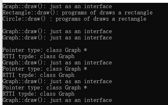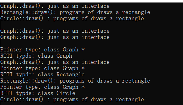 #include<iostream> #include<typeinfo> using namespace std; //definition og Graph class Graph { public: //声明时加入关键词virtual void draw() { cout << "Graph::draw(): just as an interface\n"; }; }; //definition of Rectangle, derived from Graph class Rectangle :public Graph { public: void draw() { cout << "Rectangle::draw(): programs of draws a rectangle\n"; } }; //definition of Circle, derived from Graph class Circle :public Graph { public: void draw() { cout << "Circle::draw() : programs of draws a rectangle\n"; } }; //definition of fun():as a call interface void fun(Graph* ptr) { //typeid:用于获取运行时类型信息 cout << "Pointer type: " << typeid(ptr).name() << "\n"; //Runtime Type Info的首字母缩写,运行时类型信息。 cout << "RTTI typde: " << typeid(*ptr).name() << "\n"; ptr->draw(); } //test int main() { Graph g1; Rectangle r1; Circle c1; //call by object name g1.draw(); r1.draw(); c1.draw(); cout << endl; //call by object name, and using the scope resolution operator:: r1.Graph::draw(); c1.Graph::draw(); cout << endl; //call by pointer to Base class fun(&g1); fun(&r1); fun(&c1); }