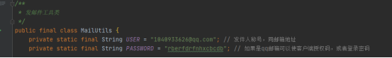 private static final String PASSWORD = ""; // 如果是qq邮箱可以使户端授权码,或者登录密码