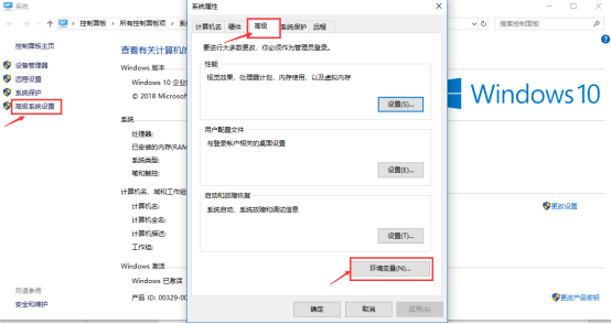 2、 点击“高级系统设置”,在弹出的系统属性框中,选择“高级”选项卡(默认即显示该选项卡),点击“环境变量”。