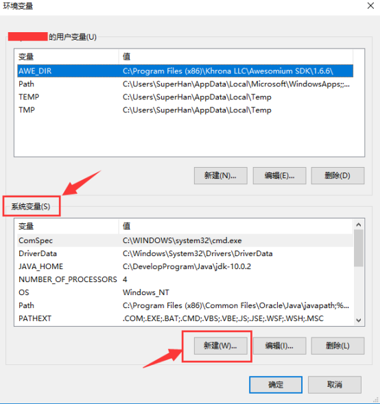 3、 在弹出的“环境变量”框,中选择下方的系统变量,点击新建。