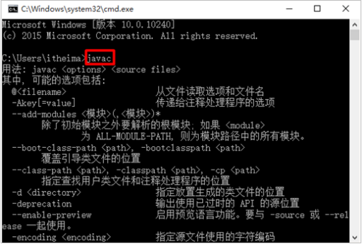 如果之前已经打开命令行窗口,需要关闭重新启动才可。在非JDK安装的bin目录下,输入java或者javac命令,查看效果。