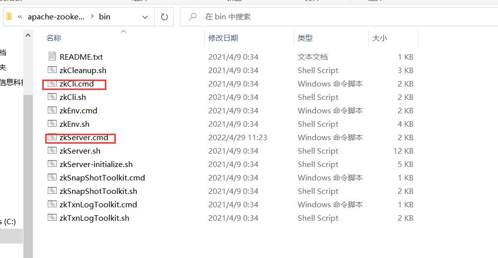 zookeeper的启动命令都在bin目录下,进入bin目录下,.cmd是Windows版本的命令,.sh 是Linux的命令。找到zkServer.cmd,