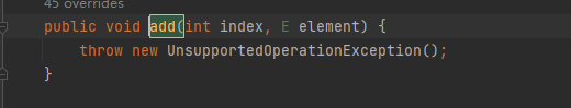 2、再看ArrayList是不是我们熟悉的那个ArrayList,也就是可以通过add,remove方法进行操作,如下图,很明显,这并不是ArrayList类,而是Arrays里面新建了一个内部类ArrayList,而这个内部类是继承于AbstractList类,AbstractList类里面的add方法是会抛出UnsupportedOperationException异常的。