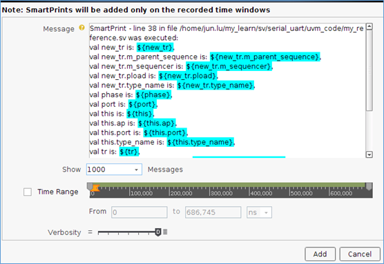 输入想打印的变量,然后选择时间范围,如果不选择,就默认为整个仿真时间,在设置打印的verbosity。
