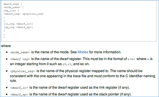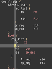 dwarf_regs段,用来描述cpu的不同mode下,dwarf寄存器与物理寄存器的映射关系。