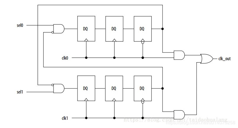 在这种情况下就会出现毛刺,产生这种问题的根本原因是切换控制信号相对于时钟信号可以在任何时间里发生改变,本质是切换信号为异步信号。 任何时钟的高电平状态下的切换都需要避免。当两个输入时钟之间是倍数关系时,插入下降沿触发触发器确保切换只发生在时钟为低电平时候,引入输出反馈确保另外一路的时钟为低电平时候发生切换,