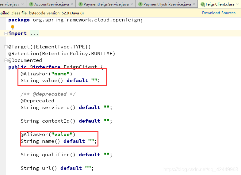 从源码可以得知,name是value的别名,value也是name的别名。两者的作用是一致的,name指定FeignClient的名称,如果项目使用了Ribbon,name属性会作为微服务的名称,用于服务发现。
