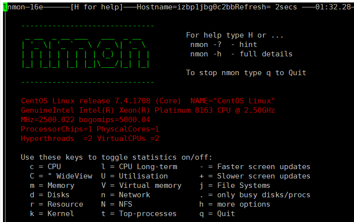 完成上面的操作后,执行 ./nmon 命令,出现如下界面,说明安装成功: