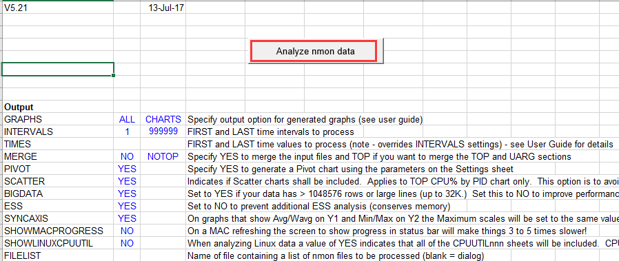 (2)解压后打开.xlsm文件,点击Analyze nmon data,打开你需要进行分析的nmon监控文件: