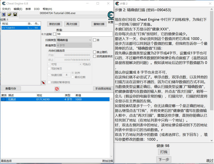 CE有个自带的教程,包括精确扫描、未知初始值、浮点数、代码查找、指针、代码注入、多级指针、共享代码,本篇记录下