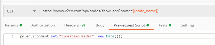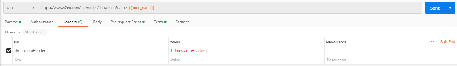 然后,您可以 通过Postman的header标签中添加 timestampHeader变量{{timestampHeader}},发送请求后,将执行您的请求前脚本,并发送timestampHeader的值代替{{timestampHeader}}。