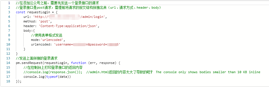 此处我们就可以在上传文件接口请求的pre-request script中添加脚本,实现发送请求的功能,具体实现见下图: