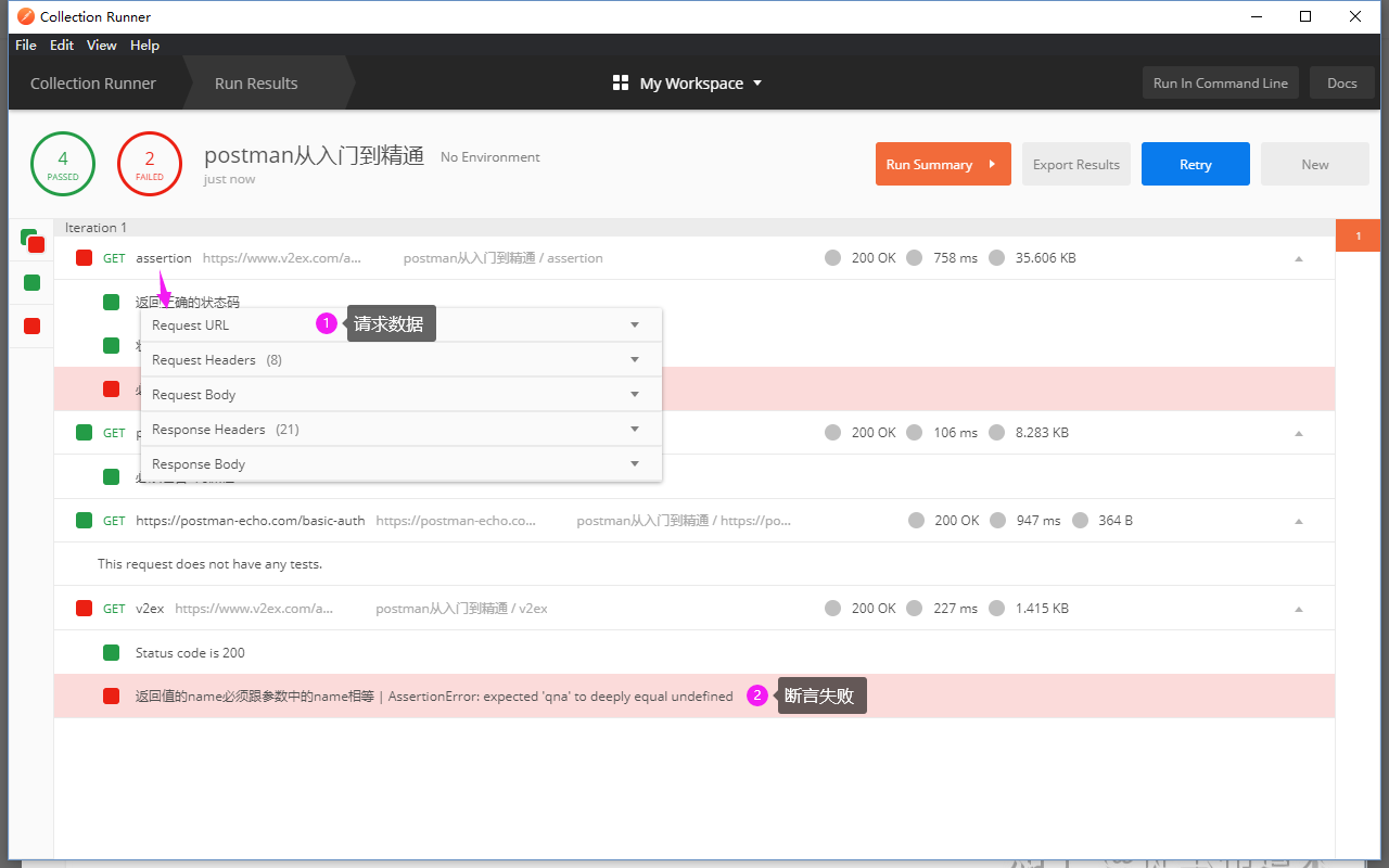3、绿色的方块表示无断言或者断言通过,红色的方块表示断言失败,有一个断言失败,则请求失败