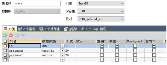 a、 新建个db_shiro 库,建个users表,添加用户名Robin,密码123456