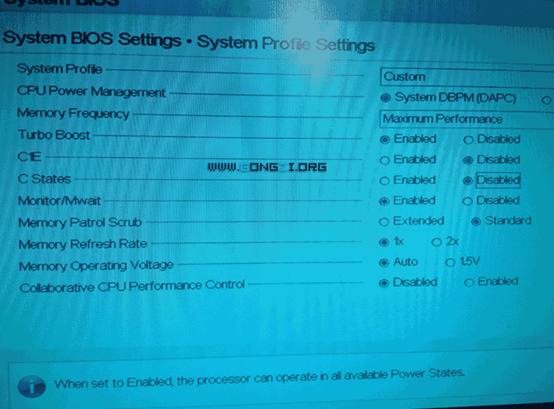 5、system Setup - System BIOS ,选择 system profile Settings,进入后将右边的 Performance Per Watt(DAPC)改为 Custom。
