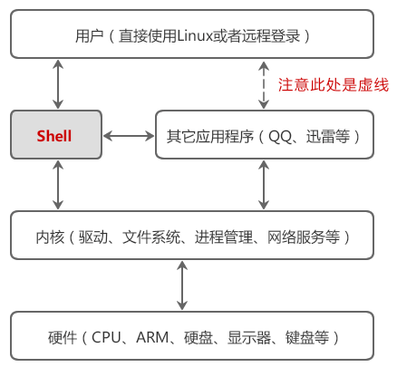 用户界面和命令行就是这个另外开发的程序,就是这层“代理”。在Linux下,这个命令行程序叫做 Shell。