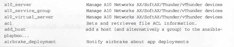 Ansible 支持商业系统或产品类应用, 系统如 AWS 的 1AM, MAC 的 osx; 软件如 Apache CloudStack、Jabberd、 Open Stack、MongoDB、MySQL、PostgreSQL、RabbitMQ、Vertica等