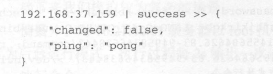 其中 192.168.37.159 是指命令执行的主机, Success 表示命令执行成功, ">> {} 表示详细返回结果如下。 ”“changed": false" 表示没有对主机做变更, ”“ping": "pong"" 表示执行了 ping 命令返回结果为 pong。
