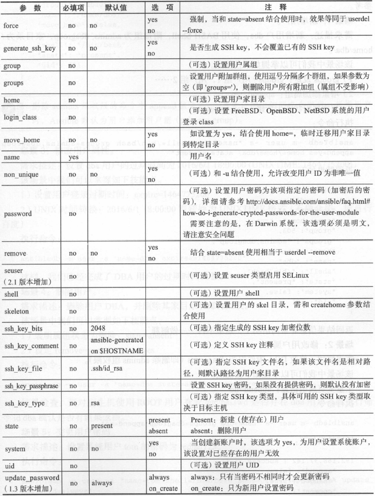 ansibledb -m user -a "name=dba state=absent remove=yes"
