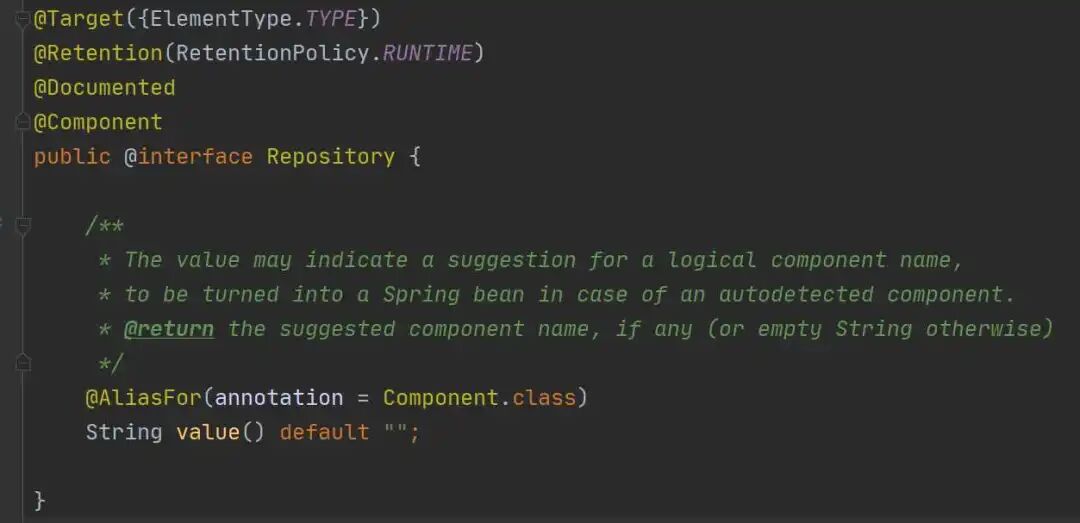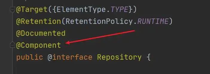 下面我们就以@Repository这个注解来看看这三个流程,首先是定义注解,这个我们可以在IDEA中按住Ctrl点进去@Repository来看,是这样的: