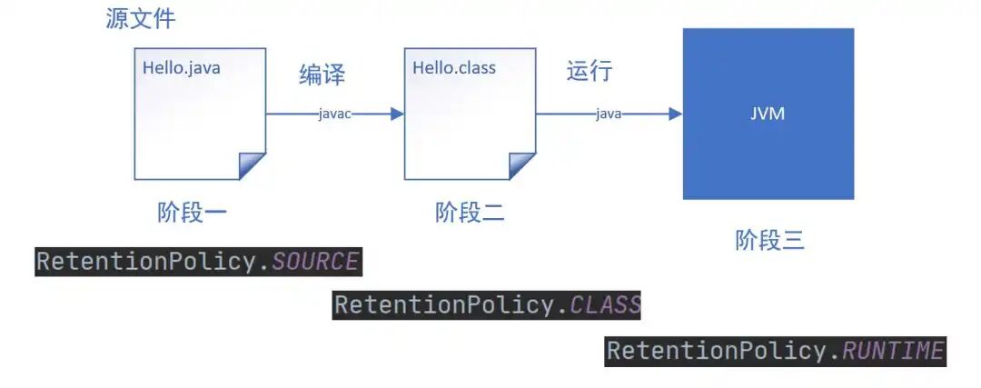 这个保留策略啊,简单来讲就是说你这个注解可以在哪个时间段起作用,这个就得说说我们的代码从写出来,然后编译到执行的主要三个阶段了,画个图就是这样的: