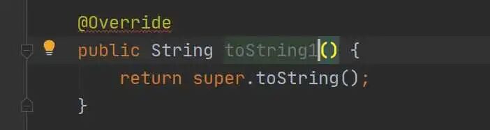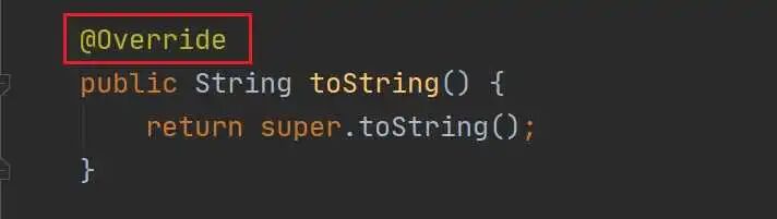 不知道这个能不能理解,就是说,对于注解而言,是有几种不同分类的,首先,我们可以自己写一个注解出来(下面会讲),另外对于JDK本身而言有自己的的注解,我们看个代码,你就知道了:比如这个,是重写toString方法,上面就有个JDK的内置注解@Override,这个注解就起到一个检验的作用,因为它是Object的方法,你现在要重写它,那么名字啊,参数啊要和之前的一样,不一样,就给你报错,不信你试试: