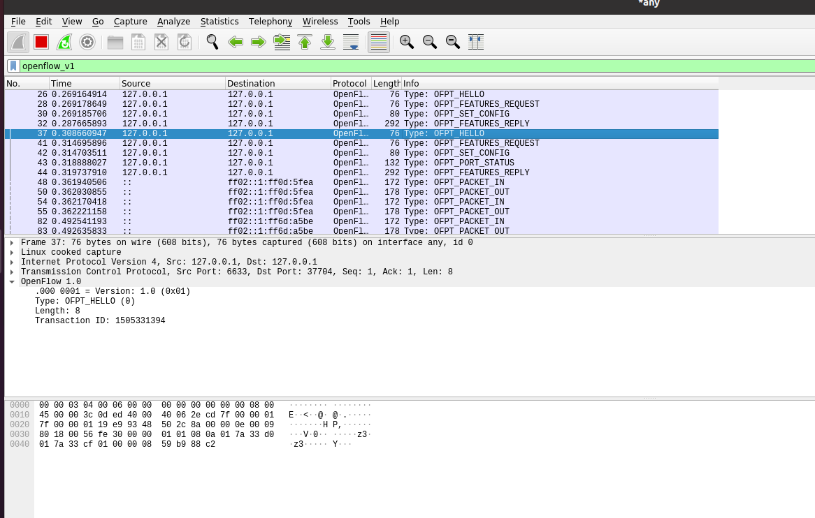 控制器6633端口(我最高能支持OpenFlow 1.0) ---> 交换机37704端口