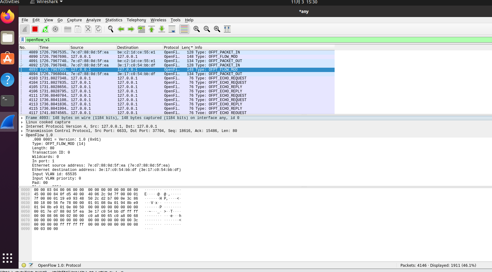 分析抓取的flow_mod数据包,控制器通过6633端口向交换机57126端口下发流表项,指导数据的转发处理