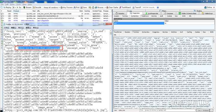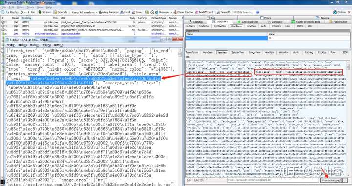 - 然后选择服务器返回的数据类型为TextView,点击.View in Notepad即打开数据记事本,如下图在记事本中找到title_area字段的内容,该字段内容进行了将中文转换为一串字符串
