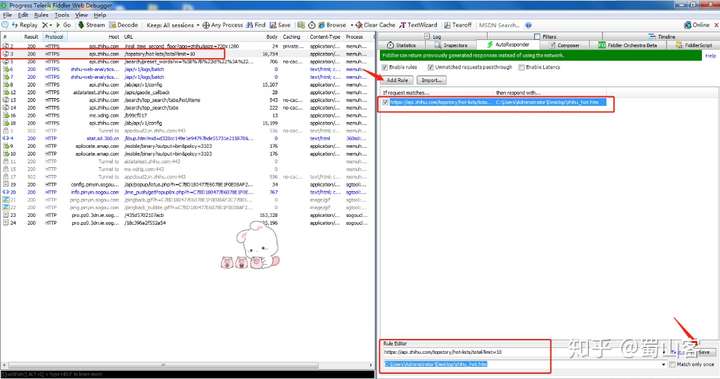 - 回到fiddler中,左侧选中热榜接口,右侧选中AutoResponder,在此窗口下点击Add Rule将左侧的接口添加进去,在右侧下方导入保存在桌面的zhihu_hot.htm文件,最后点击sava保存