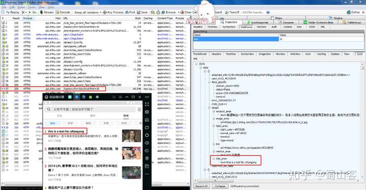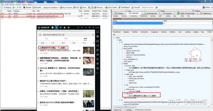 - 首先第一步,访问知乎app热榜,在fiddler软件中获取接口查看服务器响应的json格式数据,从服务器返回的json数据看出热榜标题字段名为title_area