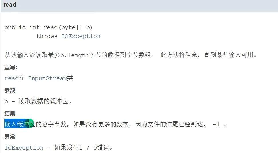 第二种括号括号里加数组的,是将数据读取暂存在数组中,循环读取数组长度的数据输出,方法返回值为读取的数据长度
