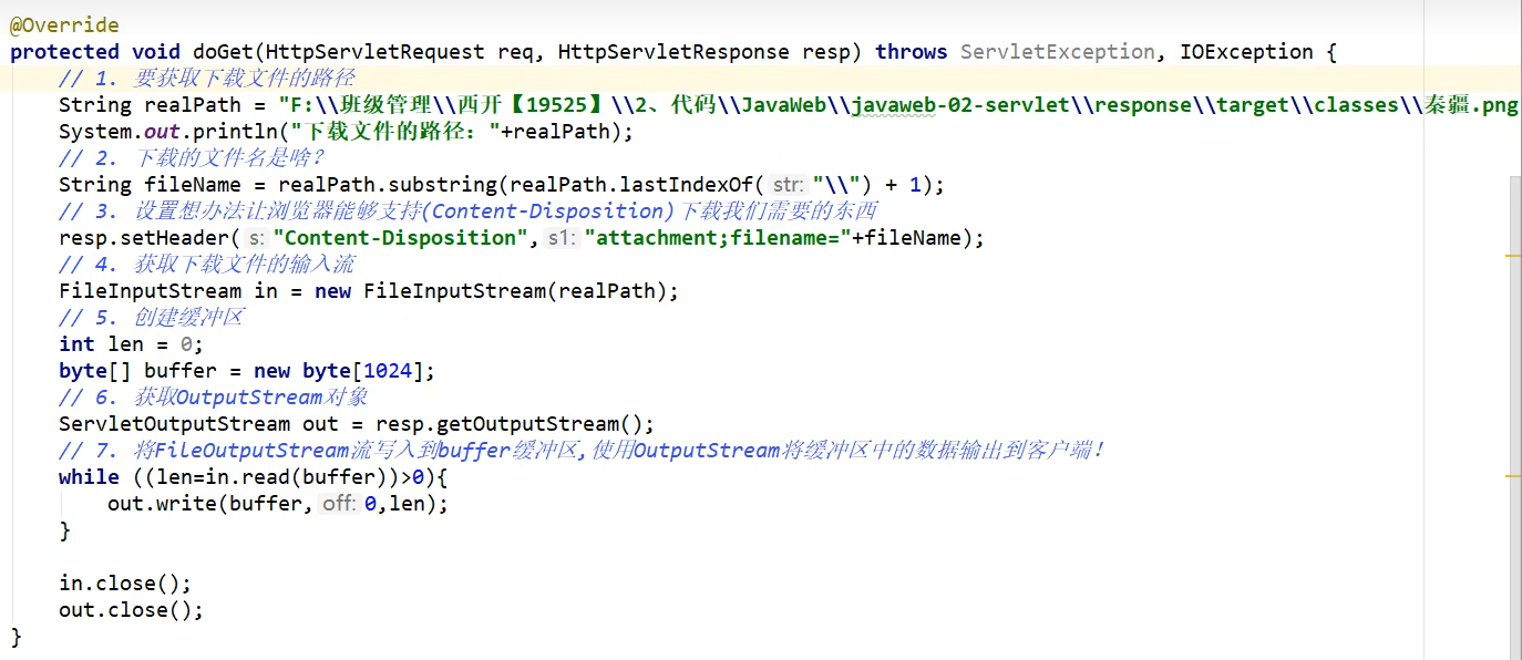 public class FileServlet extends HttpServlet { @Override protected void doGet(HttpServletRequest req, HttpServletResponse resp) throws ServletException, IOException { String realPath ="D:\\OLD\\77777\\Camera\\video_20210605_191810.mp4"; System.out.println("下载文件的路径为:"+realPath); String filename = realPath.substring(realPath.lastIndexOf("//") + 1); resp.setHeader("Content-Disposition","attachment;filename="+filename); FileInputStream in=new FileInputStream(realPath); ServletOutputStream out=resp.getOutputStream(); int len=0; byte[] guo=new byte[1024]; while (in.read(guo)>-1){ out.write(guo,0,guo.length); } in.close(); out.close(); }