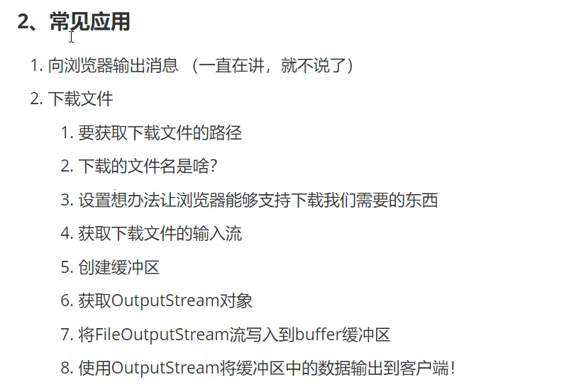 先通过FileInPutSteam的read(byte[])方法(单纯的read()方法是一次写入一个字节,返回值为asscm值,参数为字节数组的read方法返回值尾数组长度)写入数组,再通过resp的getOutPutStream创建一个文件输出流,通过write(byte[])方法将字节数组中的数据送出去