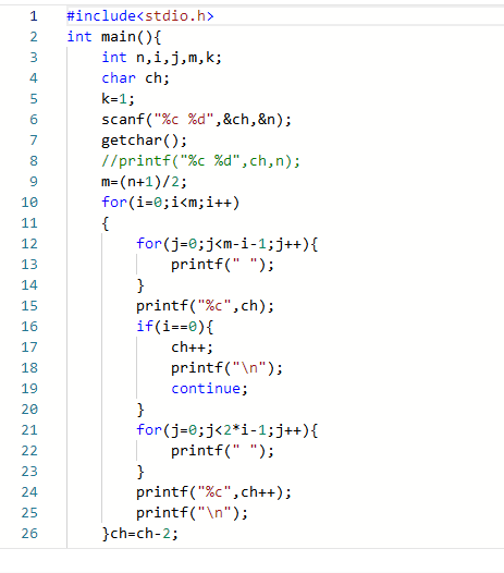 1.1本题目要求读入菱形起始字母和菱形的高度,然后输出空心字符菱形。所谓“空心菱形”是指:每行由两端为字母、中间为空格的字符串构成,每行的字符串中心对齐;上半部分相邻两行字符串长度差2,且字母从给定的起始字母逐一递增;下半部分与上半部分对称。