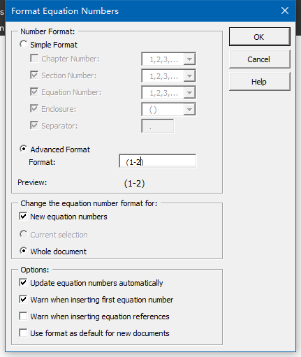 下图中选择Advanced Format 在 Format:右面的空白里面输入公式编号,点击ok即可