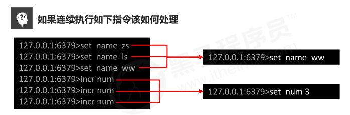 - 对同一数据的多条写命令合并为一条命令;如lpush list1 a、lpush list1 b、lpush list1 c可以转化为:lpush list1 a b c。为防止数据量过大造成客户端缓冲区溢出,对list、set、hash、zset等类型,每条指令最多写入64个元素。