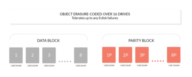 - Minio使用纠删码erasure code和校验和checksum来保护数据免受硬件故障和无声数据损坏。即使你丢失一般数量(N/2)的硬盘,你仍然可以恢复数据。